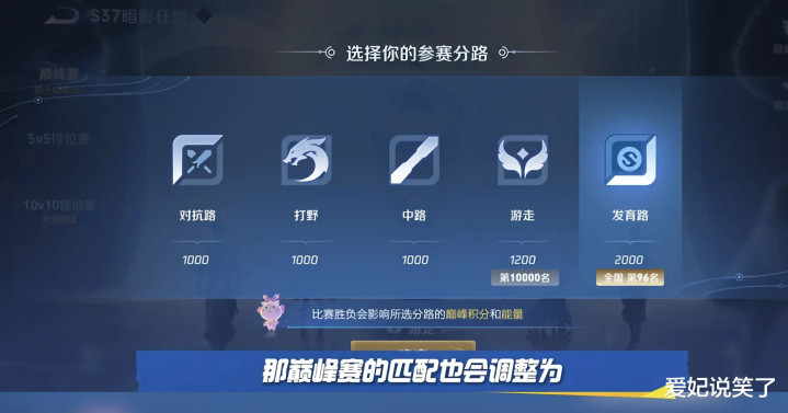 你还真别说,就是这么个意思,可是我想知道的是当初的5条分路玩法不是取消了吗?如今又套到巅峰赛上面,难道真的就一定要分的这么细致化吗?